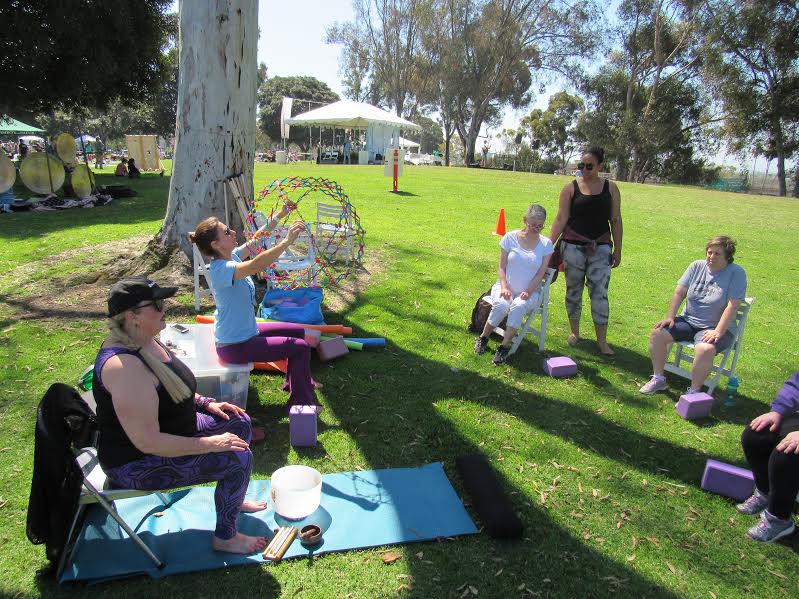 What I found to be one of the most wonderful aspect of teaching at this event was that we were actually able to get our feet in the grass, to hear the sounds of environment both urban AND natural; rush of the wind in the trees, the birds in the sky, the ambient noise of traffic on the street beyond the park, and even the airplanes cruising overhead (yes, we were directly in the airport landing flight path). The contrast of the warm sun, the shade and scent of eucalyptus trees and the feel of the damp cool grass and earth were wonderful grounding sensations. In fact, when I went on later that afternoon to the group class practice, I found that my balance was actually